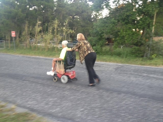 In 2014, while driving home from dinner with my sweetie along busy SR 52, we spotted a man stranded on his motorized scooter with a dead battery. We pulled over to offer assistance. Although he couldn’t speak anymore, he had the most endearing smile. He didn’t have any identification, but the name “Larry” was written on the inside of his shirt collar. Recognizing that he might be a local resident of a nearby ALF, I asked him, and he nodded in acknowledgment. My husband and I pushed him about a quarter of a mile before I sent him back to retrieve the car, while I continued to push Larry another two miles. I’m happy to report that Larry made it back to his assisted living facility just in time for his evening meal (see the picture below).